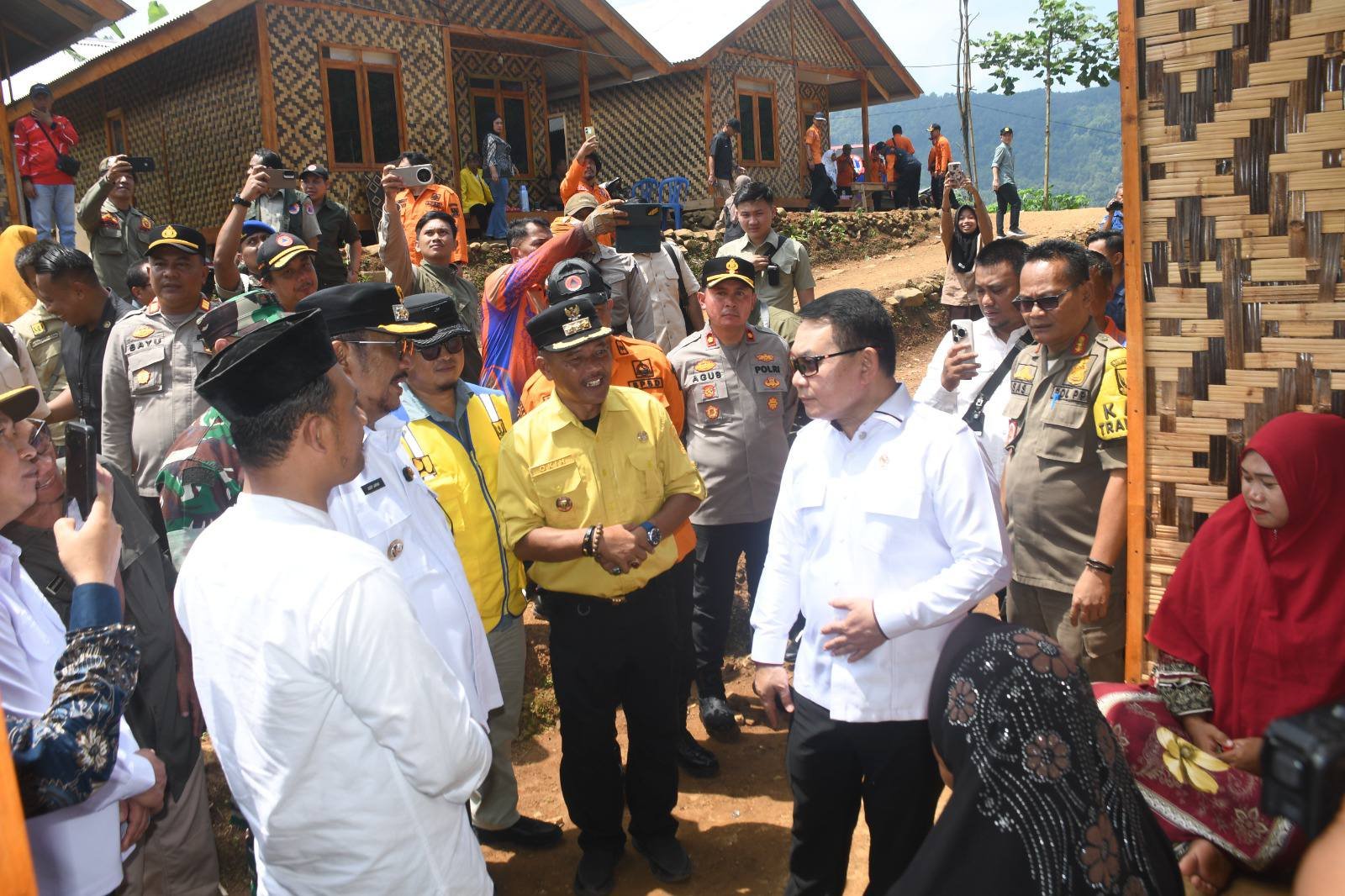 Dailytoday.id – Sukabumi – Bupati Sukabumi H Asep Japar bersama Wakil Bupati H Andreas mendampingi kunjungan kerja Penasihat Khusus Presiden Bidang Pertahanan Nasional, Jenderal TNI (Purn.) Prof. Dr. H. Dudung Abdurachman dalam peresmian hunian tetap (huntap) adaptif bencana di Desa Sukarame, Kecamatan Cisolok, Kabupaten Sukabumi, Kamis (16/4/2026).